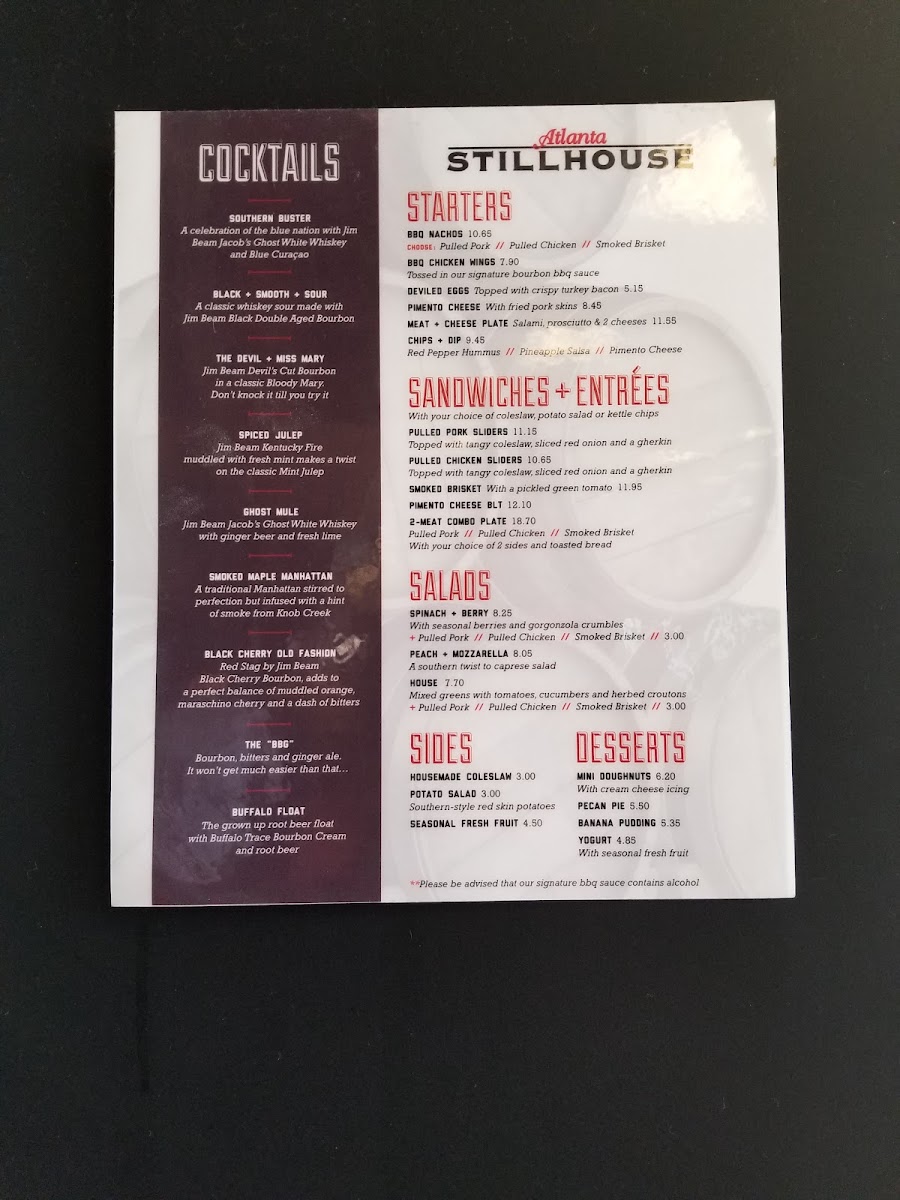 The menu at Atlanta Stillhouse offers a relaxed blend of hearty barbecue and thoughtfully curated drinks, perfect for casual gatherings and unwinding moments. You’ll find comforting plates like the smoked brisket sandwich and pulled pork with classic sides such as coleslaw and potato salad, alongside lighter options like garden and tuna salads for a balanced choice.